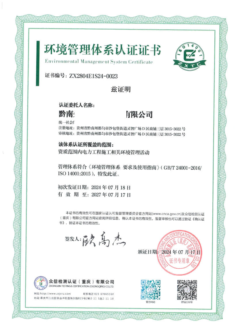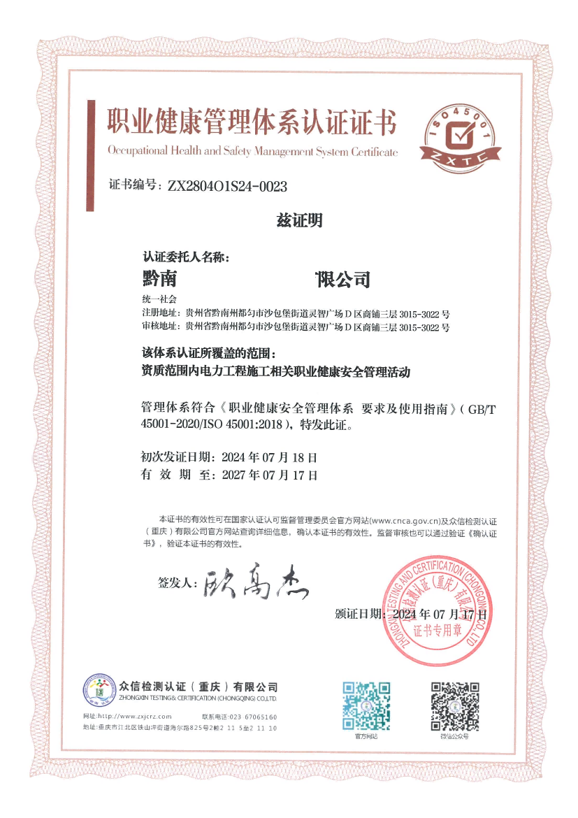恭喜我公司服务的企业黔南州大众电力建设有限公司iso三体系成功下证!