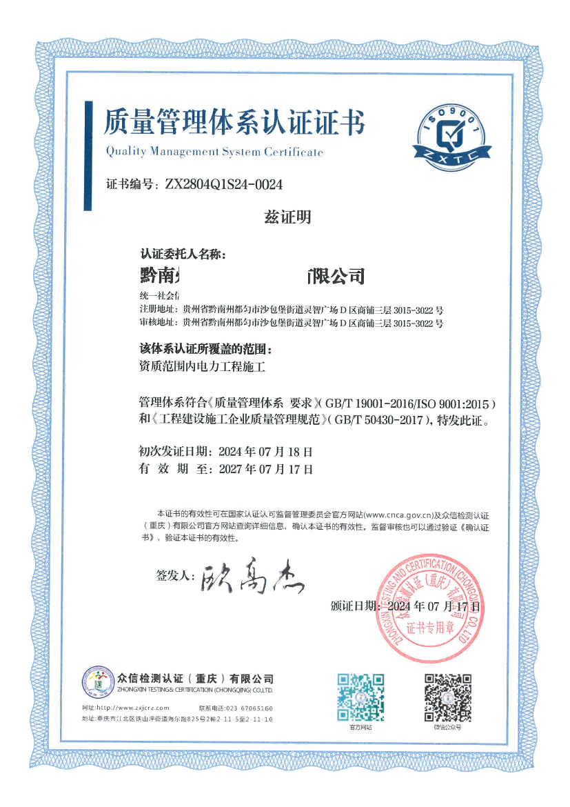 恭喜我公司服务的企业黔南州大众电力建设有限公司iso三体系成功下证!
