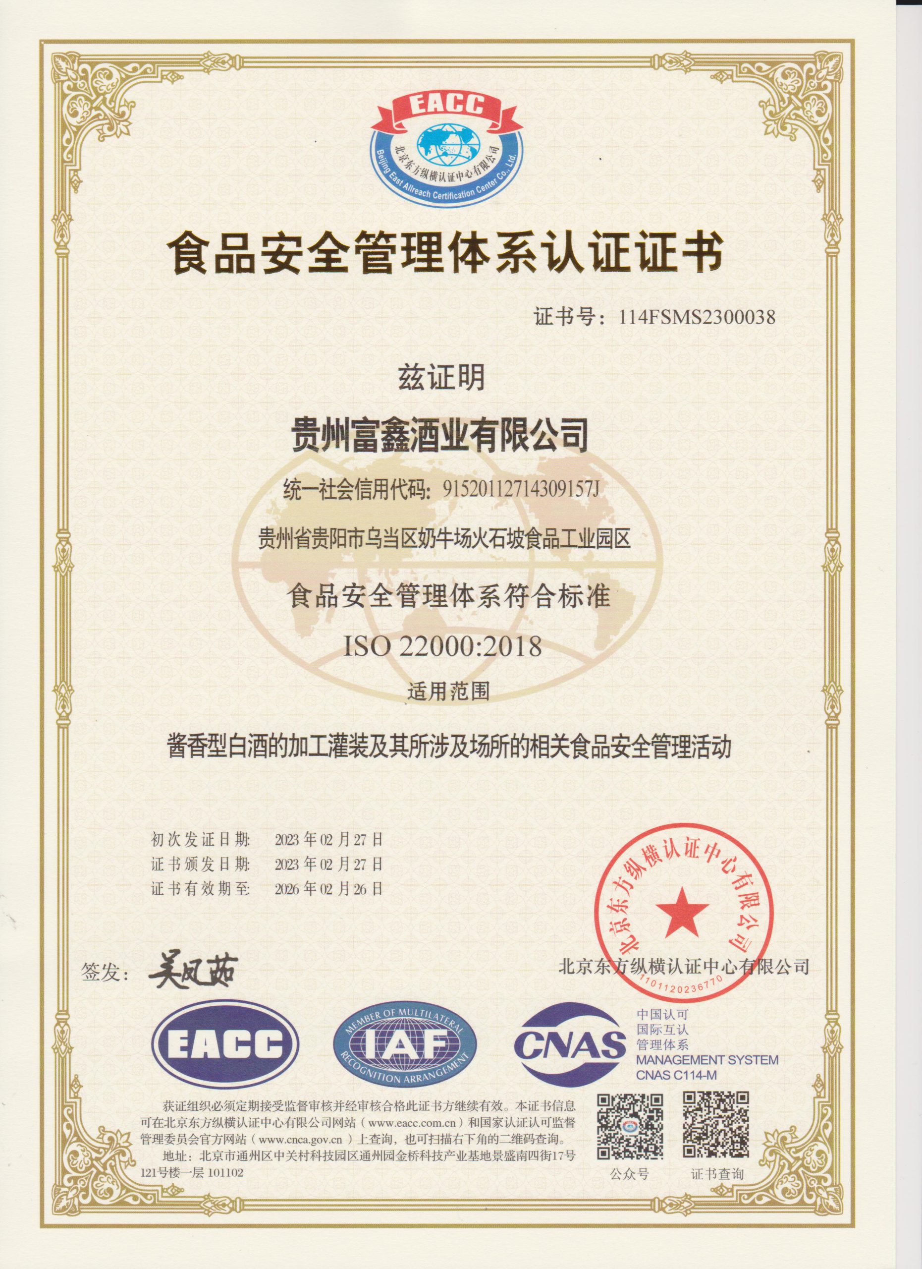 恭喜我公司服务企业贵州富鑫酒业有限公司获得ISO22000食品安全管理体系认证