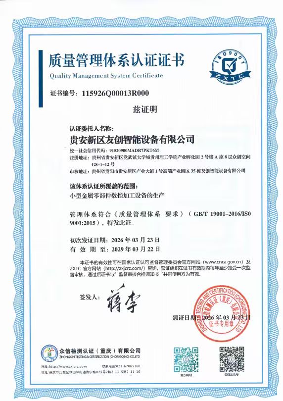 贵安新区友创智能设备有限公司iso9001质量管理体系认证