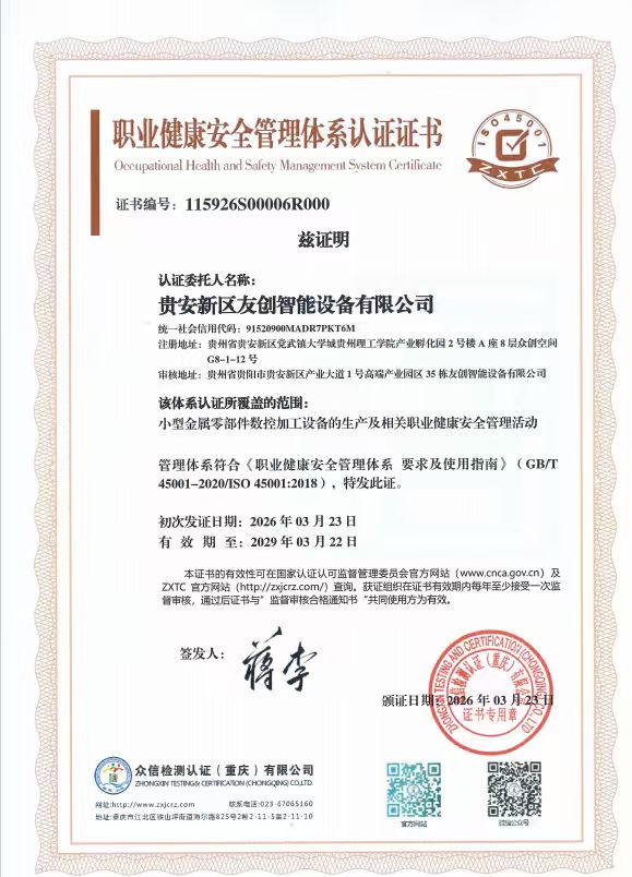 贵安新区友创智能设备有限公司iso45001职业健康安全管理体系认证