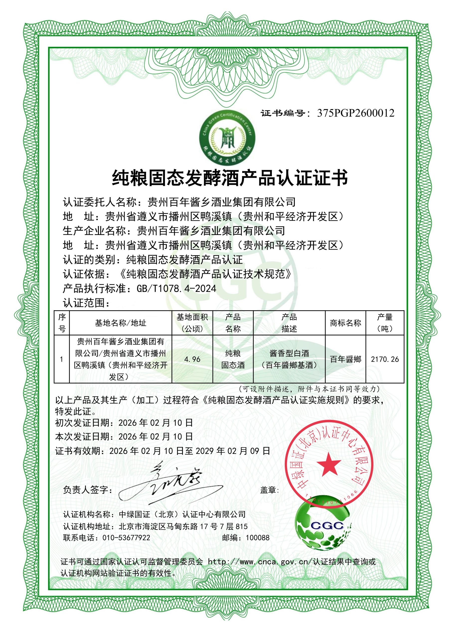 贵州百年酱乡酒业集团有限公司-纯粮固态发酵酒产品认证
