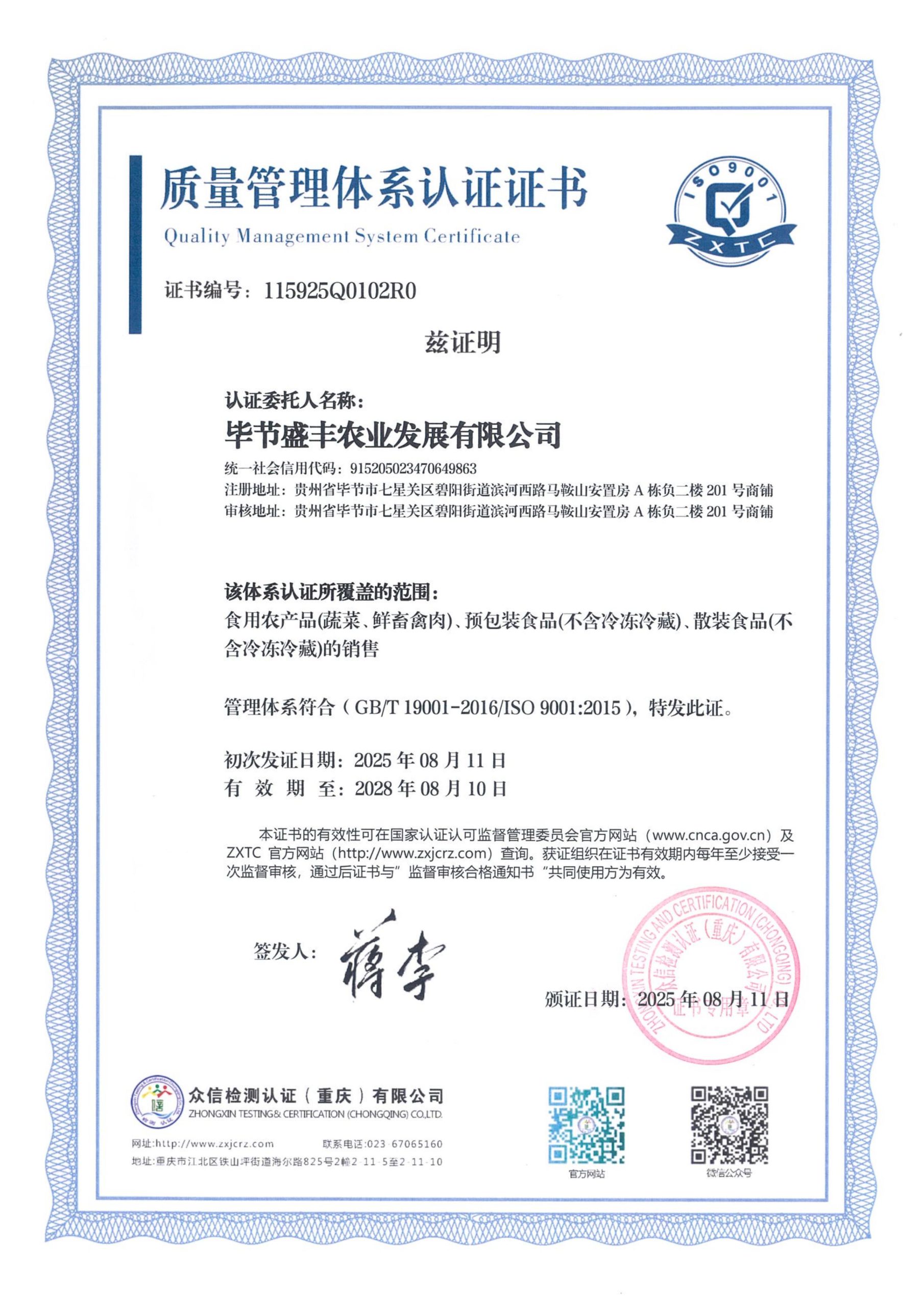 毕节盛丰农业发展有限公司-质量管理体系认证证书