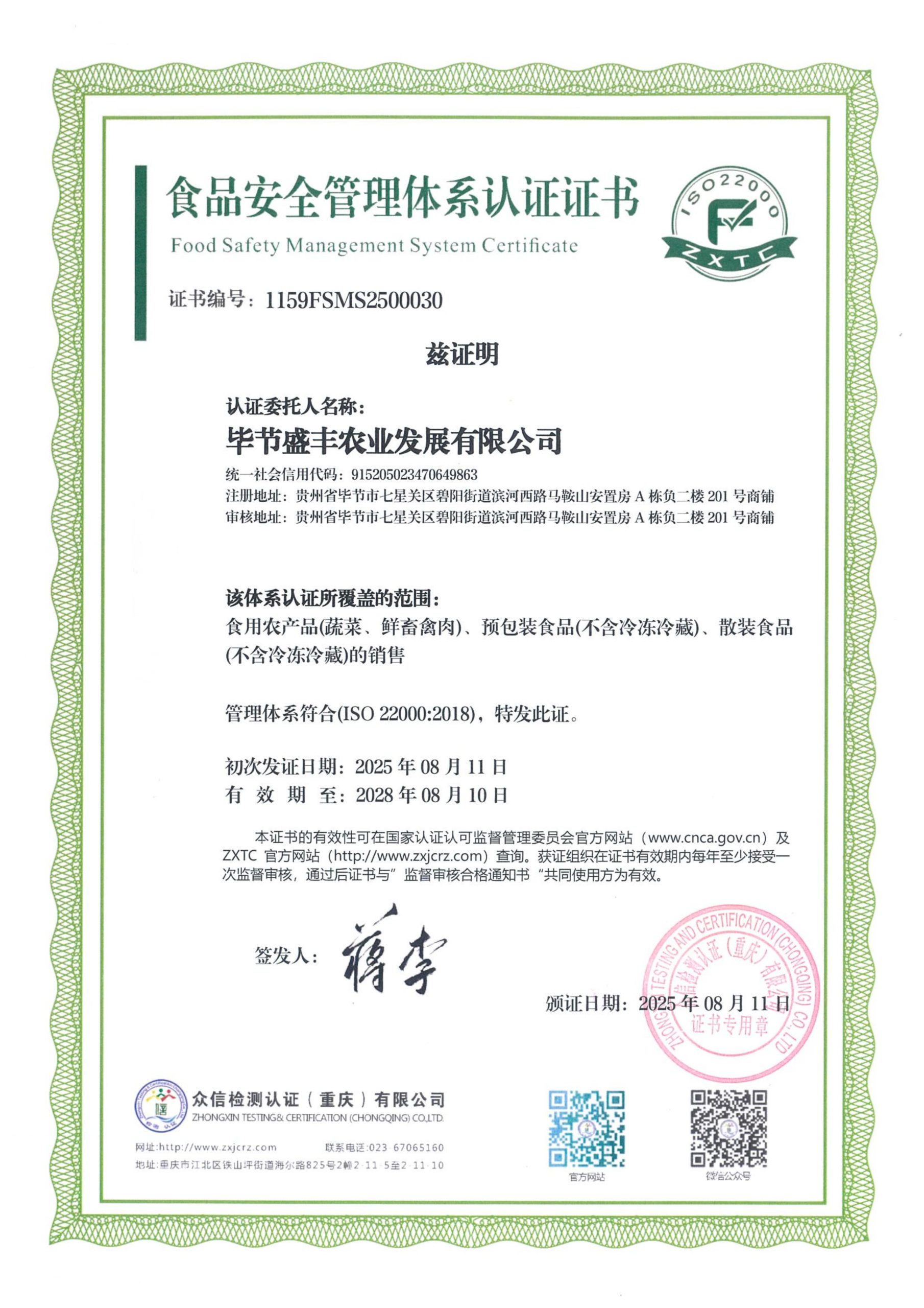 毕节盛丰农业发展有限公司-ISO22000食品安全管理体系认证