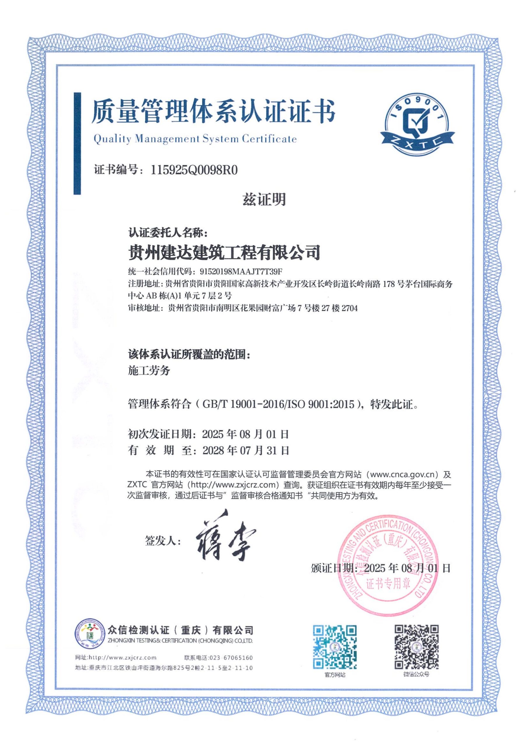 贵州建达建筑工程有限公司-质量管理体系认证证书